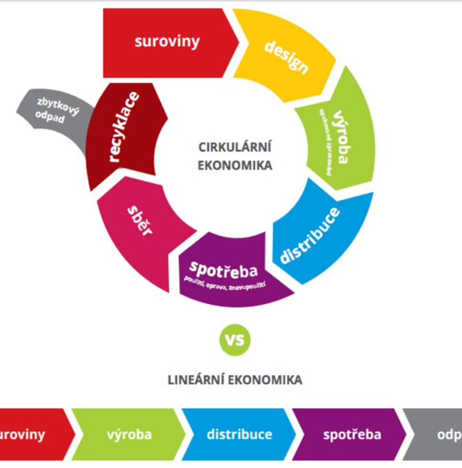 • While the current economy and production works largely in a linear way – from raw materials, through the design, production and use of the product to the end of its life and waste production, the circular economy is trying to circle this flow of material and energy, source: server Nazeleno.cz (2020).